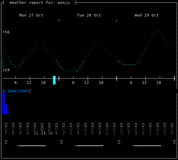 Weather: Clear, +49°F, 43%, 10mph, 1022hPa Timezone: Asia/Seoul Now: 18:35:46+0900 | Dawn: 06:20:35 | Sunrise: 06:47:51 Zenith: 12:12:10 | Sunset: 17:35:58 | Dusk: 18:03:13 Location: 원주시, 강원, 대한민국 [37.3420,127.9196]Follow @igor_chubin wttr.in pyphoon wego